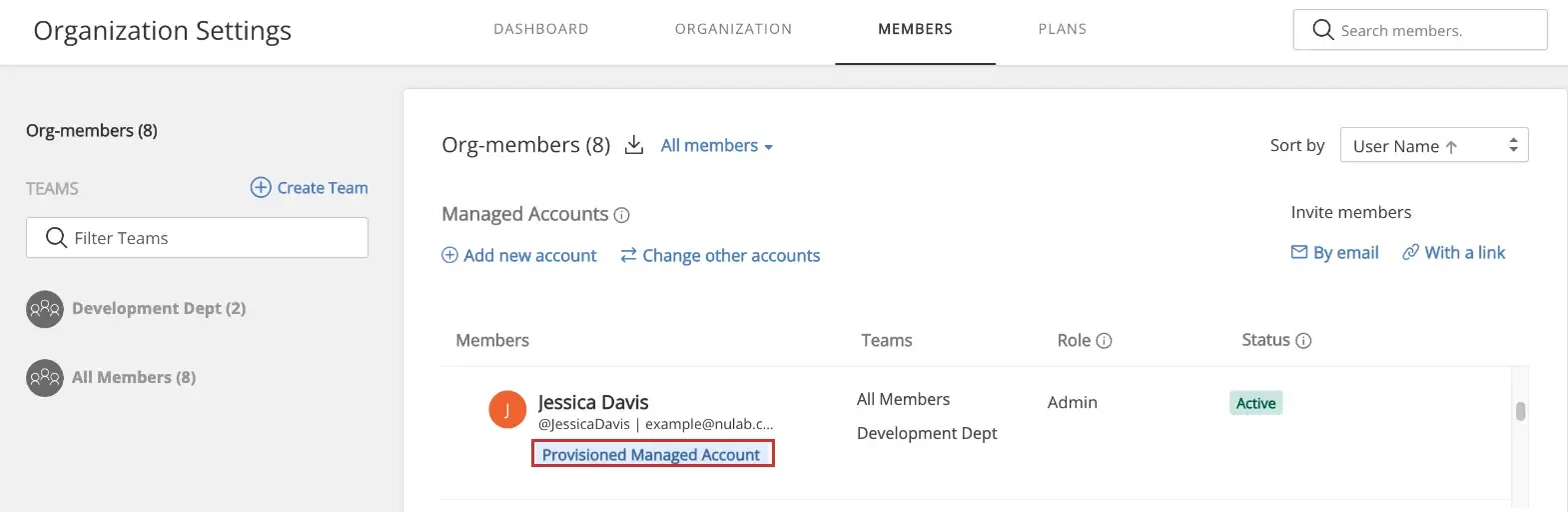 Basic specifications and precautions are the same as adding, editing, and deleting Managed Accounts. Accounts added or updated by the Nulab Account API are labeled as “Provisioned Managed Account.”